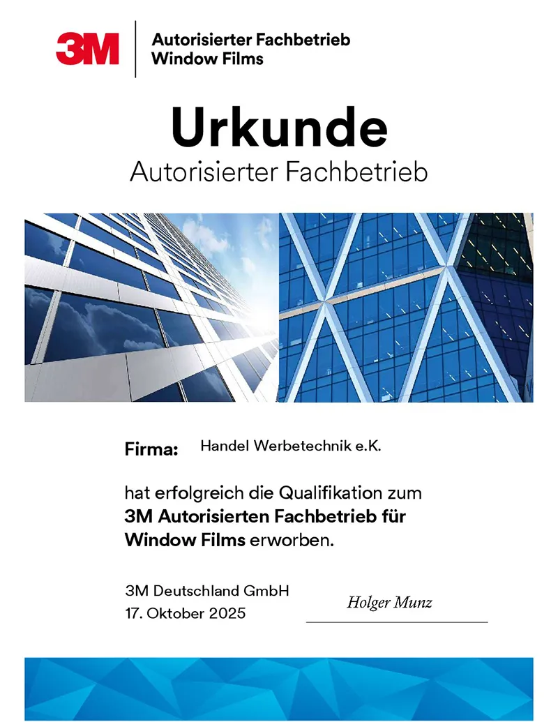 Als zertifizierter 3M Partner bieten wir Ihnen geprüfte Markenqualität, professionelle Beratung und fachgerechte Montage.